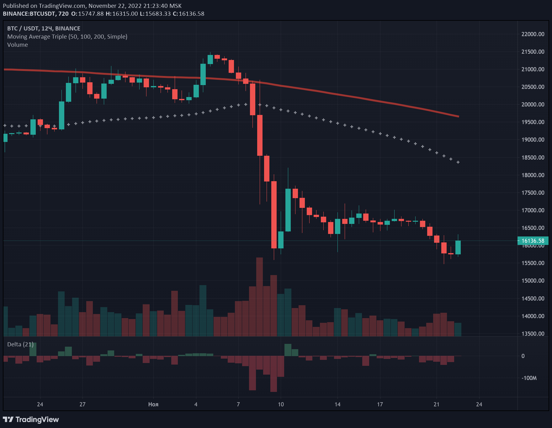 По данным скринера криптовалют Cryptovizor, анализирующего рыночную цену BTC/USD на крупнейших спотовых биржах, 21 ноября актив обновил на Binance минимум на отметке $15 476. К моменту публикации цена биткоина выросла до $16 136.