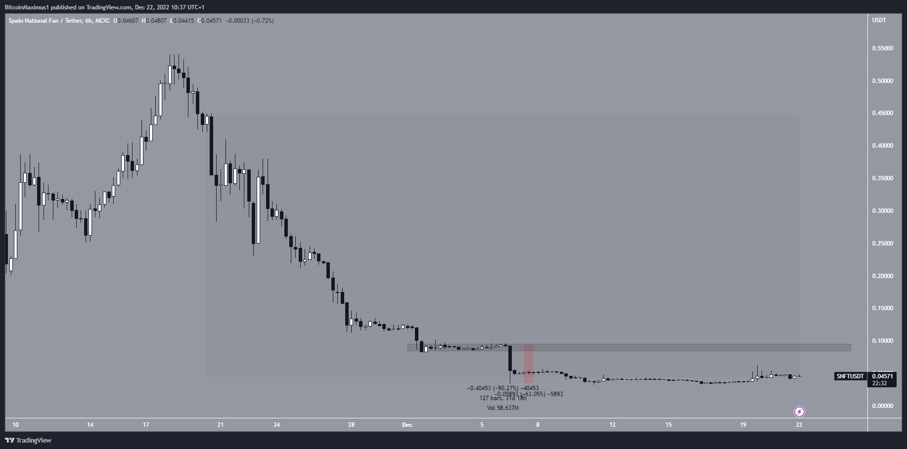 Курс SNFT с начала Чемпионата мира по футболу обвалился на 90%, при этом после того, как 6 декабря Испания неожиданно уступила марокканцам, токен подешевел на 62% (красный значок). В тот же день он достиг исторического минимума на $0.033.