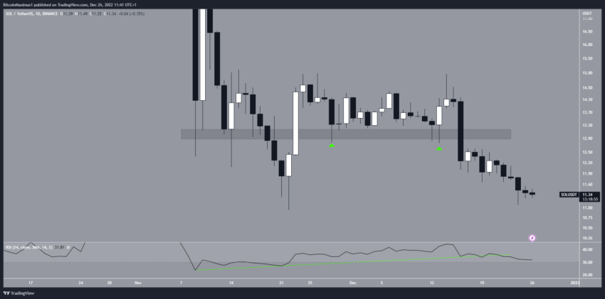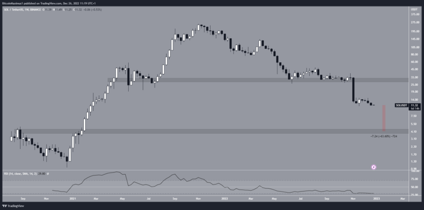 В период с мая по ноябрь 2022 года цена SOL отскочила к горизонтальной области поддержки $29, однако 14 ноября обвалилась на фоне массивной медвежьей свечи. К концу месяца котировки токена обновили минимум этого цикла в $10,94.