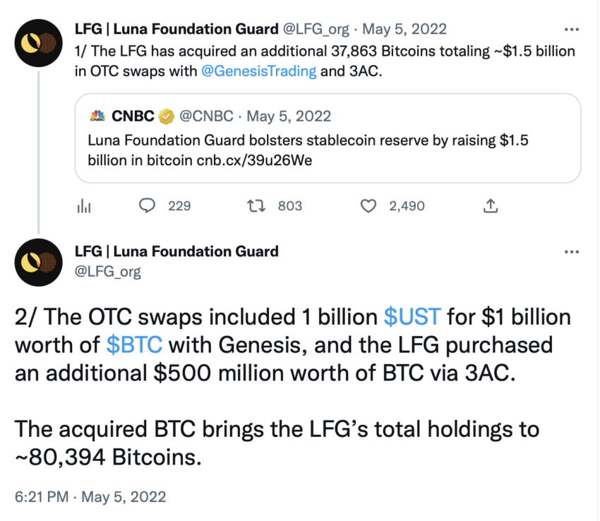 Все началось в мае 2022 года, когда Luna Foundation Guard приобрел у Genesis и 3AC 37 863 BTC в рамках внебиржевого свопа. Через несколько дней после этого алгоритмический стейблкоин экосистемы Terra UST рухнул, создав на рынке настоящий хаос, и утащил за собой еще несколько проектов — в том числе лендинговые платформы Celsius и Voyager.