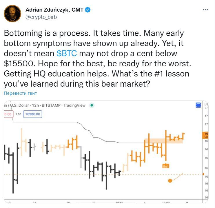 «Поиски дна – это процесс, для которого нужно время. Многие признаки дна уже проявились. Тем не менее, это не значит, что биткоин не может подешеветь ни на цент от $15500 [предполагаемое циклическое дно]. Надейся на лучшее, готовься к худшему», — написал он в своем микроблоге.