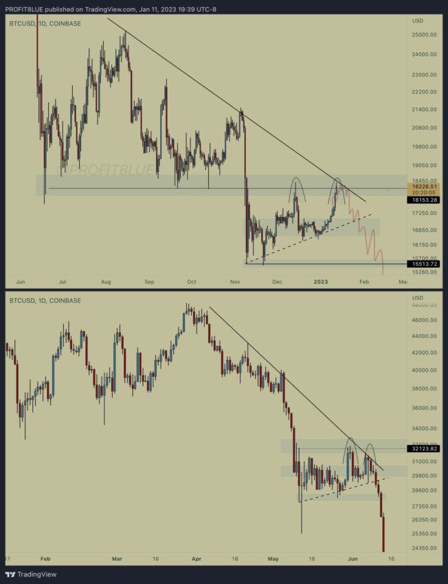 Негативный прогноз биткоина также дал аналитик, ведущий микроблог под ником PROFIT BLUE. По его мнению, за вспышкой роста последует коррекция, которая выведет монету к новым минимумам. Свой прогноз биткоина аналитик проиллюстрировал при помощи сравнения текущего поведения монеты с ее движениями летом 2022 года.