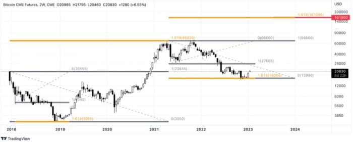 Волновая теория Эллиотта рисует радужную картину, на которой курс BTC вырастет до $161 800 уже летом 2023-го. Прогноз с использованием «Расширения Фибоначчи» оказался более консервативным и предусматривает достижение $161 800 в начале 2024-го.