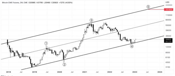 Согласно волновой теории Эллиотта, в конце 2022-го завершилась коррекция стоимости биткоина, и в январе этого года началась последняя пятая волна текущего цикла. Принимая во внимание предыдущие донья и пики, можно предположить, что её верхняя точка будет расположена на отметке $161 800.