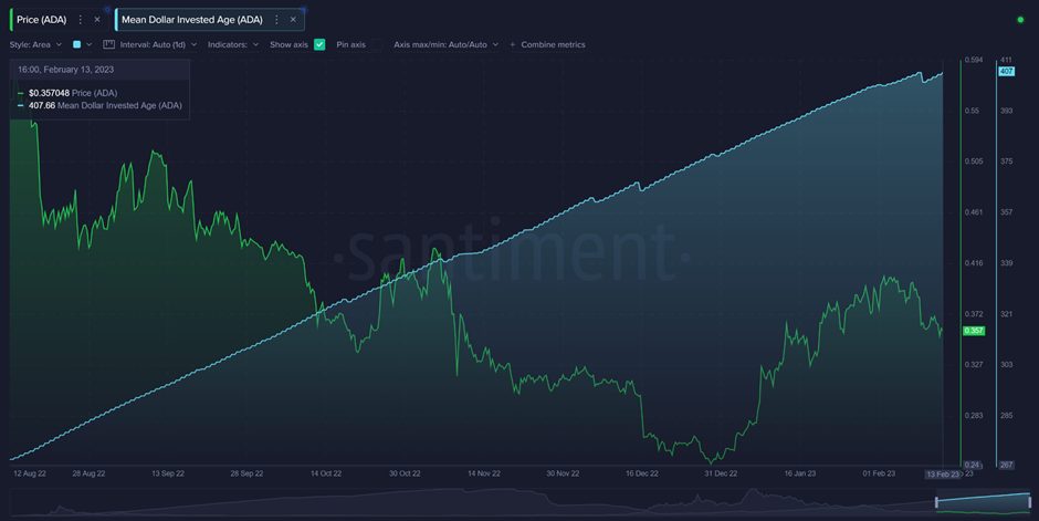 Менее благоприятным признаком для ADA является тот факт, что инвестиции в монеты в сети Cardano не претерпевают изменений. В среднем время нахождения монет на адресе составляет около 407 дней. Это огромное увеличение по сравнению с 267 днями шесть месяцев назад.
