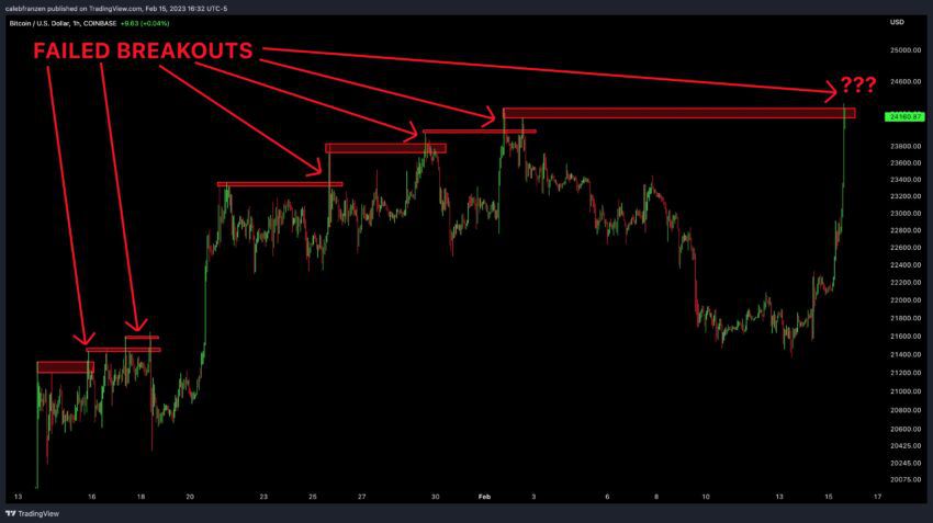 С мнением коллеги согласился аналитик Калеб Франзен. Он обратил внимание пользователей сети на ложные пробои BTC, за которыми неоднократно монета выходила в коррекцию.
