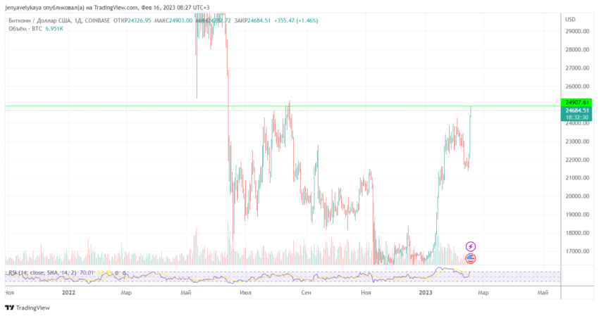 Утром 16 февраля 2023 года самая капитализированная криптовалюта — биткоин (BTC) — обновила локальный максимум, приблизившись к уровню $25 тыс. впервые с августа 2022 года.