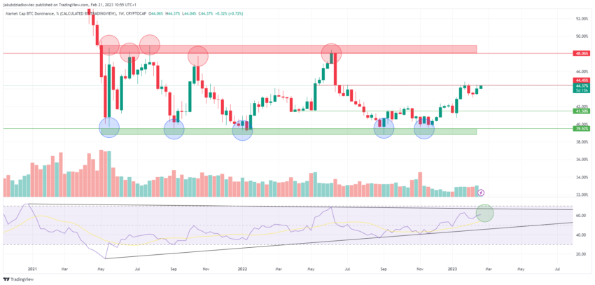 С тех пор доминация уперлась в сопротивление в диапазоне 48-49% (красные круги) и поддержку в диапазоне 38,50-39,50% (синие круги). В 2022 году появились еще два ключевых уровня: поддержка на уровне 41,50% и сопротивление на уровне 44,50%.