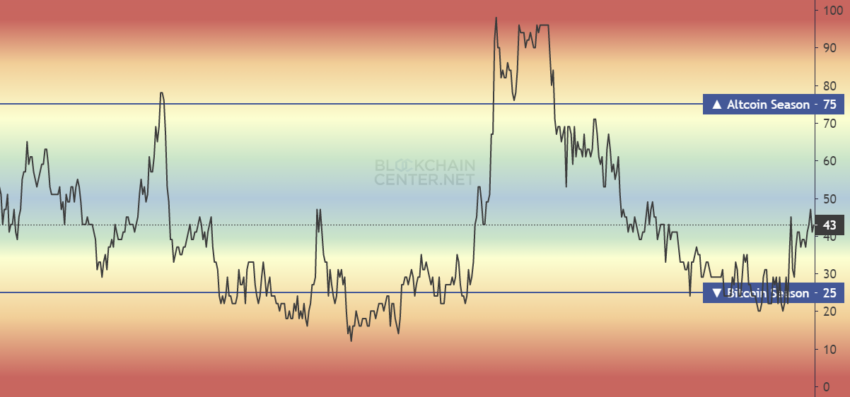 В настоящее время значение индекса составляет 43 пункта. Если он продолжит расти, то долгожданный сезон альткоинов можно ожидать через несколько недель или месяцев.