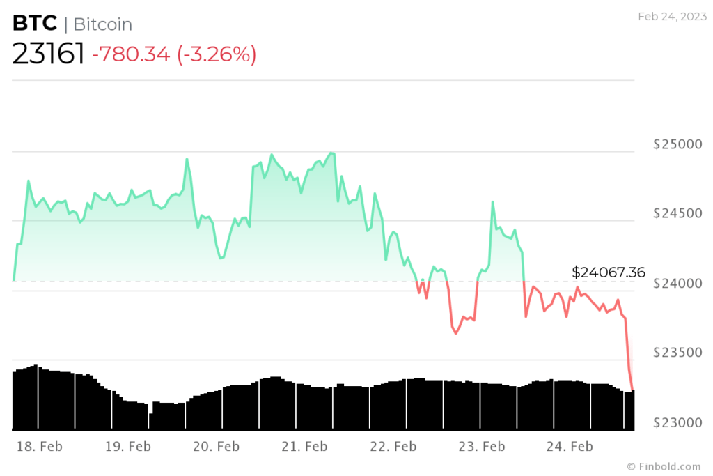 Вечером 24 февраля биткоин торговался по $ 23 161, регистрируя дневные потери порядка 3%.