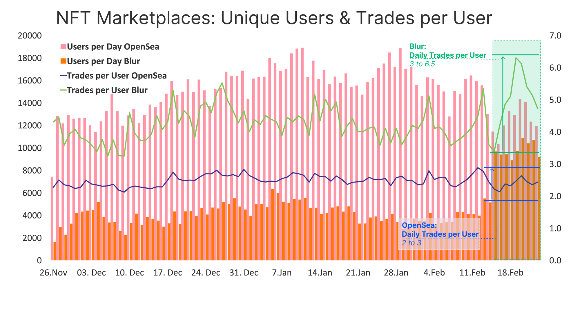 При помощи вознаграждений в utility-токенах площадка успешно расширила глубину рынка, мотивируя пользователей размещать заявки с целью увеличения частоты продаж NFT и улучшения пользовательского опыта. По соотношению числа приходящихся на одного трейдера совершенных сделок Blur превосходит OpenSea — от 3 до 6,5 против 2-3.