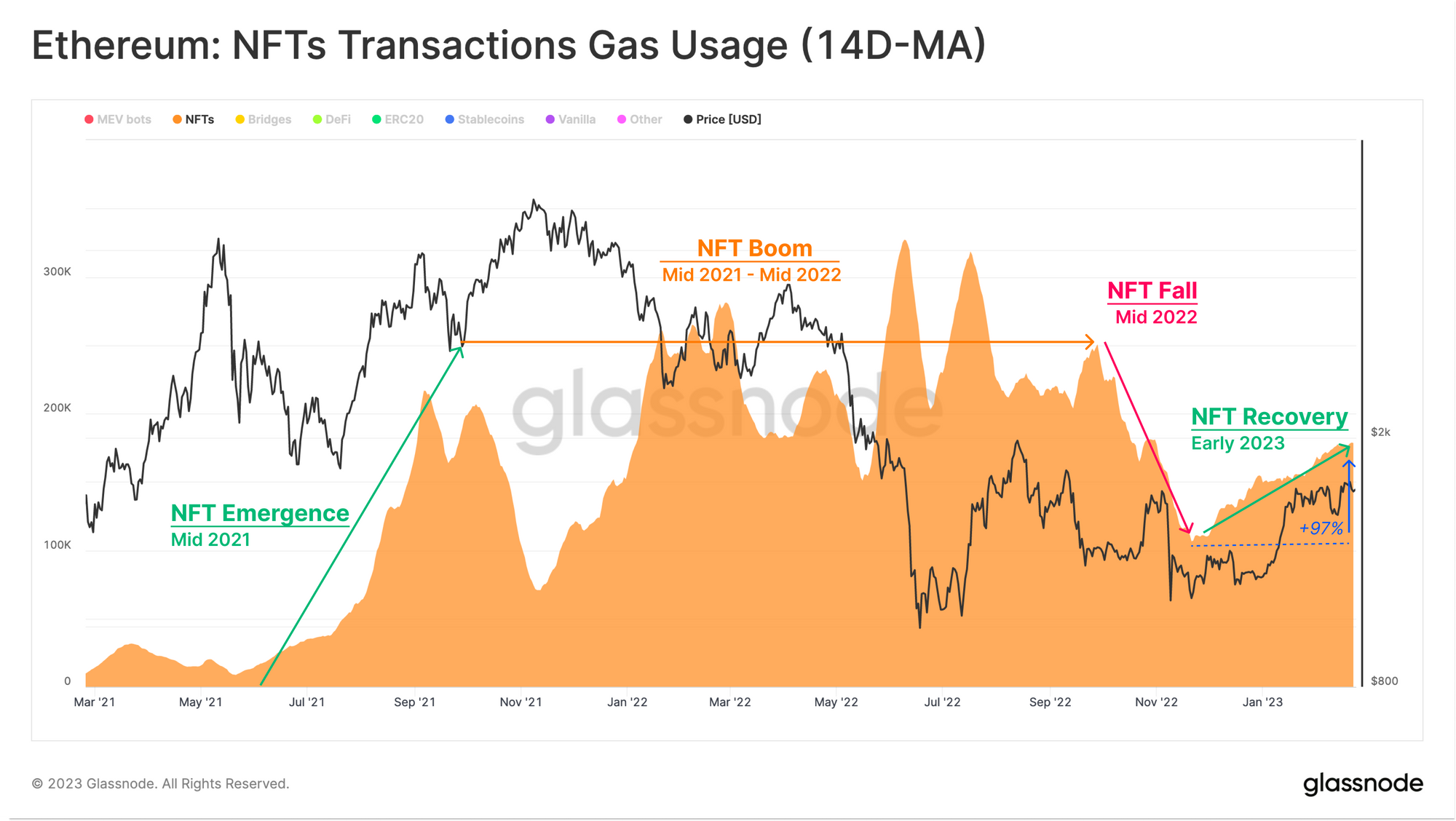 При изучении структуры использования газа аналитики обнаружили увеличение числа транзакций, связанных с NFT. После резкого снижения к декабрю на протяжении последних двух месяцев этот показатель увеличился почти вдвое. Метрика все еще остается ниже значений, характерных для бума прошлого года.
