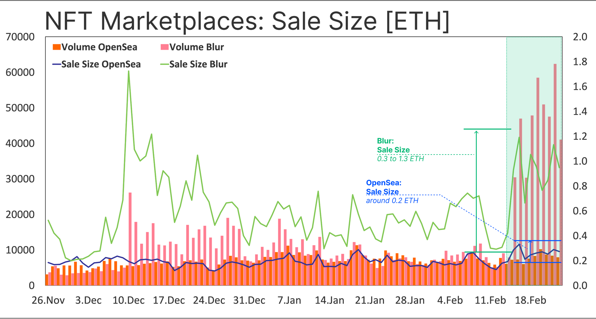 Успех рыночной стратегии и выбора целевой аудитории Blur подтверждает более высокий показатель среднего объема продаж NFT — от 0,3 до 1,3 ETH против 0,2 ETH у OpenSea.