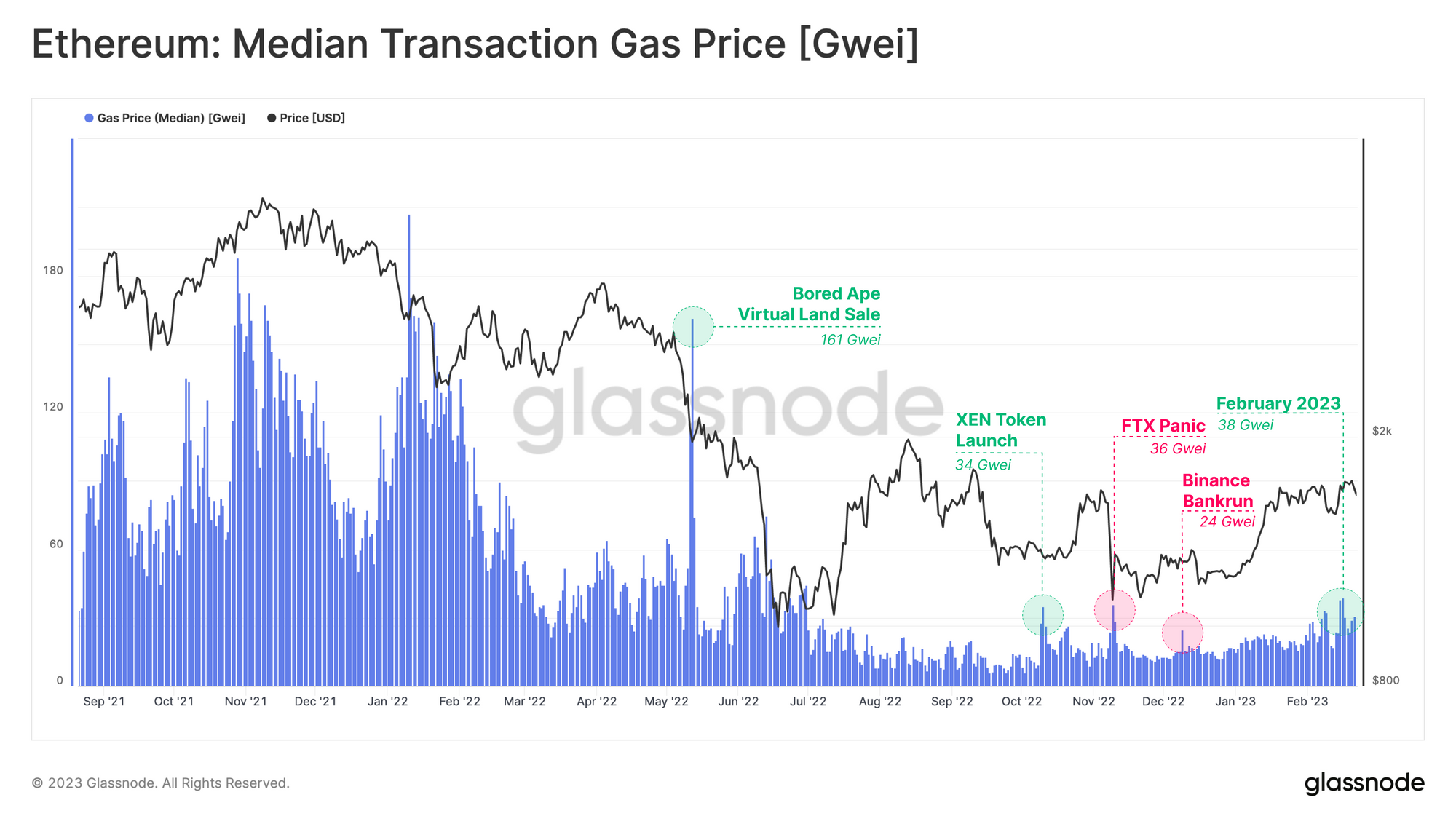 С начала этого года фиксируется постепенный, но устойчивый рост цен на газ до 38 Gwei. До этого в течение девяти месяцев показатель варьировался в диапазоне от 10 до 20 Gwei, за исключением периодов, связанных с FUD вокруг Binance и крахом FTX.