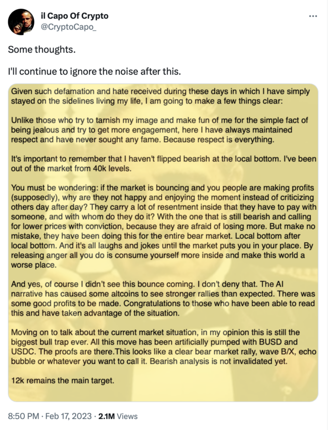 Криптотрейдер @CryptoCapo_ приобрел известность после того, как предсказал падение цены BTC с $40 000 до $20 000. С тех пор он не раз предупреждал своих подписчиков о продолжении снижения по крайней мере к $12 000. За последний месяц он появлялся в «Твиттере» все реже, а его последнее сообщение появилось 17 февраля. В нем аналитик назвал текущую рыночную ситуацию «самой большой бычьей ловушкой в истории» и добавил, что тренд по-прежнему медвежий.