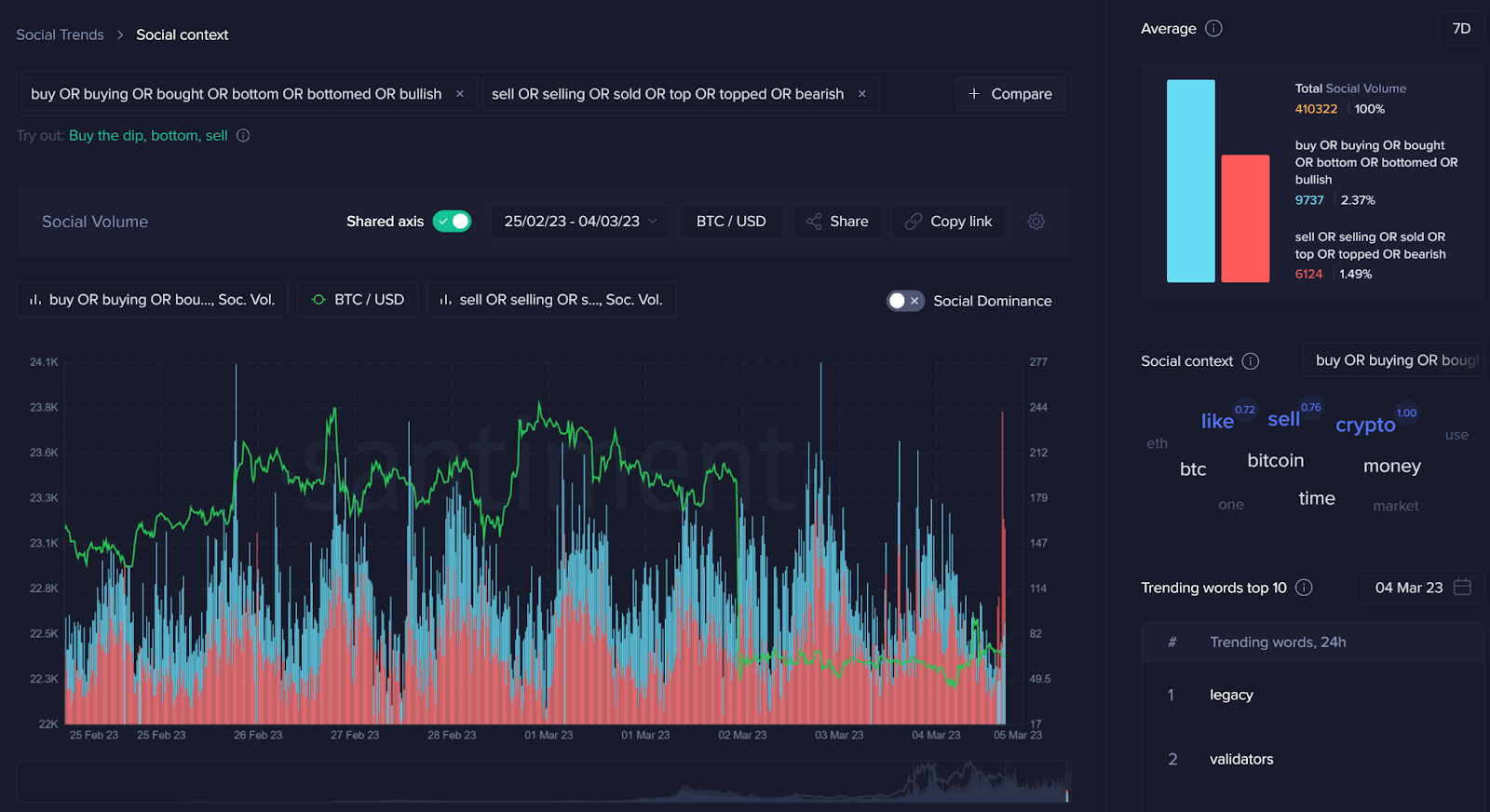 На диаграмме социальных настроений, которая демонстрирует соотношение «бычьих» и «медвежьих» слов, видно, что всплеск негатива начался после недавнего отката биткоина ниже $22 000.