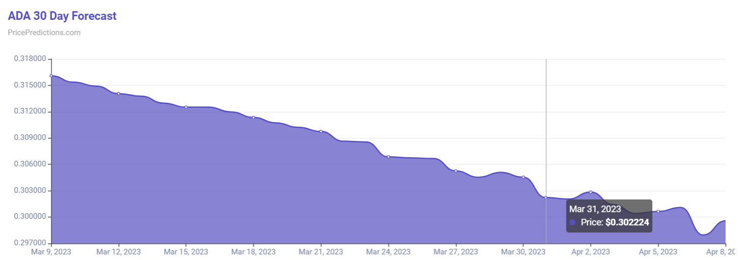 Алгоритмы на основе машинного обучения на платформе прогнозирования цен на криптовалюты PricePredictions установили цену Cardano (ADA) к 31 марта 2023 года на уровне $ 0,3022.