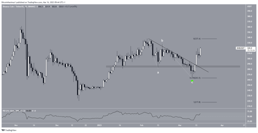 Дневной таймфрейм подтверждает бычий прогноз. Для этого есть несколько причин. Во-первых, цена Binance Coin отбилась от нисходящей линии сопротивления, которая существовала с начала февраля. Это признак смены тренда на восходящий. Во-вторых, BNB завершил коррекционную структуру A-B-C и отбился от линии сопротивления.