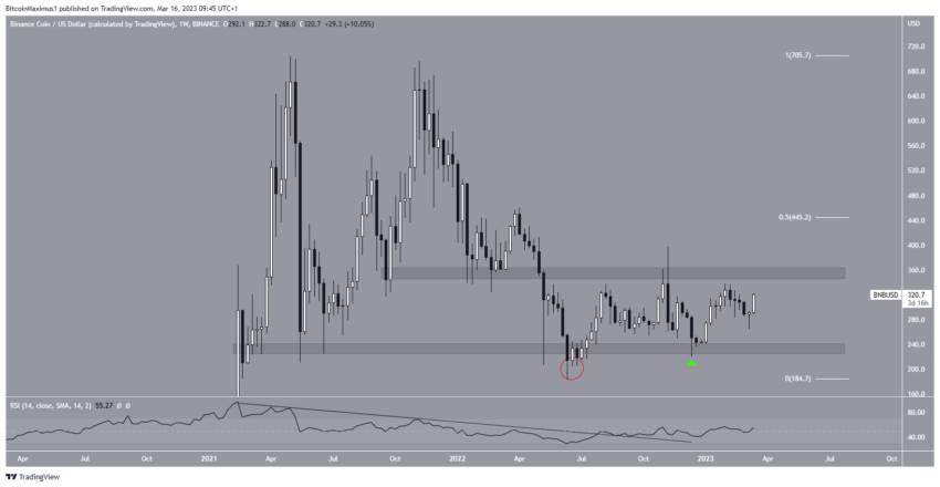 Технический анализ недельного таймфрейма показывает, что с апреля 2022 года Binance Coin торгуется в долгосрочном диапазоне между $240 и $360. Цена актива отклонилась от нее всего один раз – на графике этот момент отмечен красным кругом.