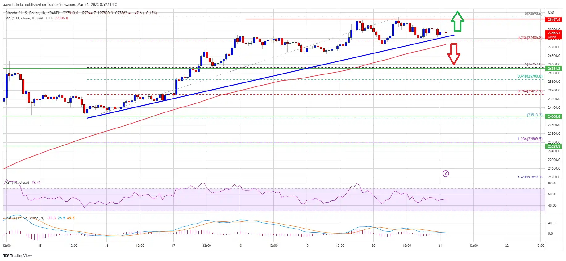 Курс биткоина сейчас находится выше $27 000 и 100-часовой простой скользящей средней. На часовом графике пары BTC/USD также формируется основная линия бычьего тренда с поддержкой около $27 700.