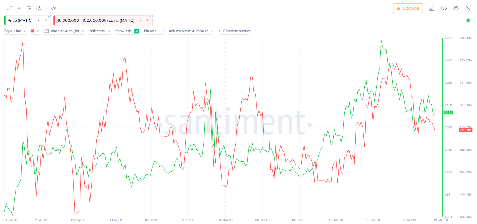 За период с 22 февраля по 21 марта эта группа крупных участников рынка сократила свои запасы монет MATIC с 253 млн до 211 млн. При этом паттерны покупок и продаж, совершаемых китами, стали демонстрировать высокую корреляцию с динамикой курса MATIC.