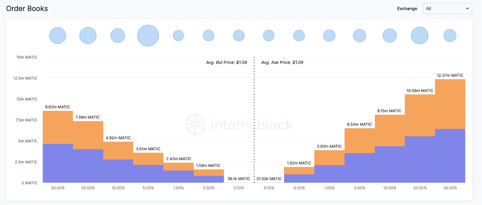 С помощью модели глубины рынка можно выделить ключевые зоны поддержки и сопротивления. Согласно ей, текущий медвежий тренд может затормозить на 5% ниже текущих ценовых уровней. Это область $1,03 с совокупным спросом в размере 3,5 млрд MATIC.