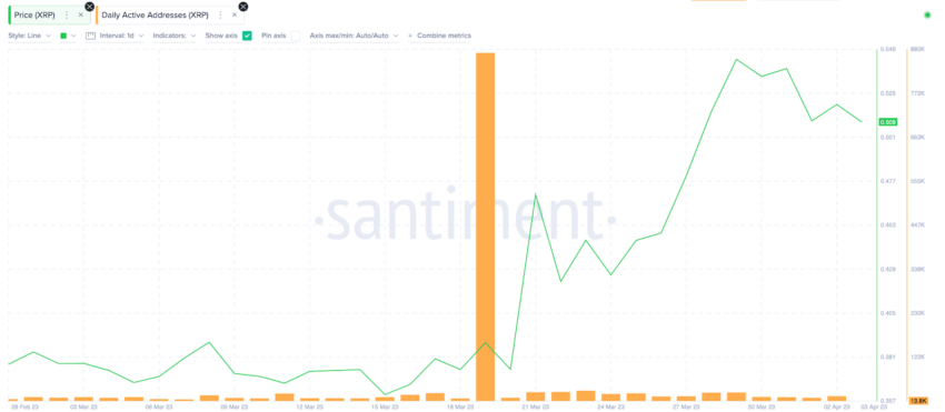 Резкое расхождение между недавним ценовым действием и количеством активных адресов в сети также подтверждает возможность развития медвежьего сценария. Как показано на графике ниже, ежедневный объем трафика в сети значительно снизился – с 871 000 19 марта до 26 000 3 апреля. Это произошло на фоне того, как цена XRP выросла на 34%.