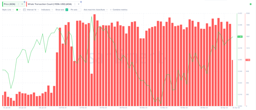 Согласно данным Santiment, киты Cardano сохраняют высокую активность уже три месяца подряд. На приведенном ниже графике видно, что в последний раз количество превышающих $100 000 транзакций опускалось ниже 1000 15 февраля. С тех пор оно неизменно оставалось выше 1600, а 4 апреля выросло до 2007.