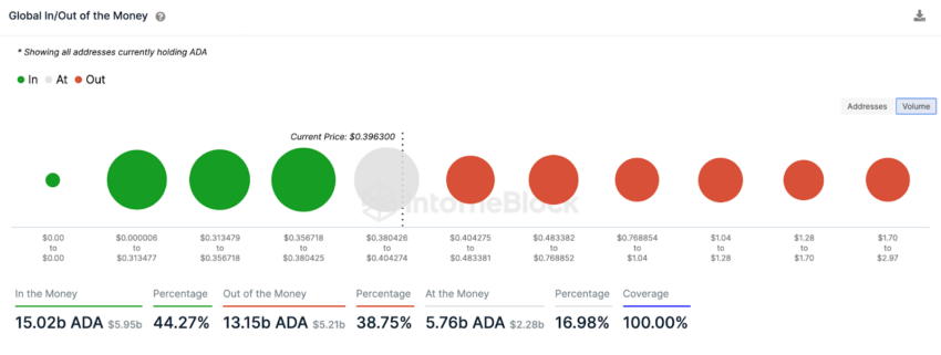 Данные In/Out of Money платформы IntoTheBlock показывают, что цена Cardano в скором времени может достичь отметки $0,45.