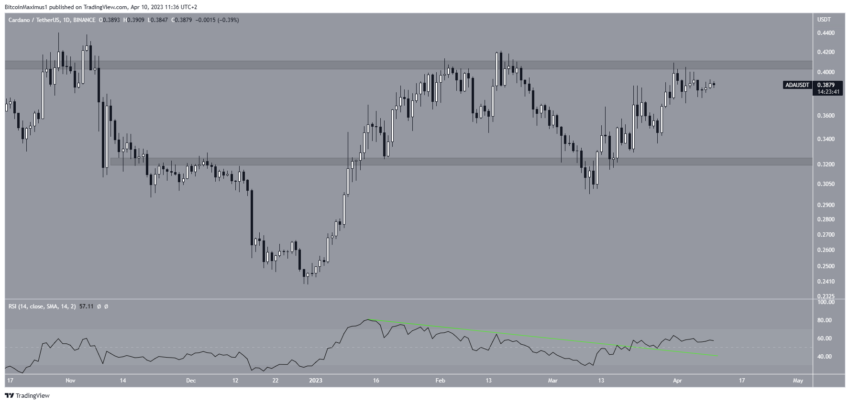 Технический анализ дневного таймфрейма не дает четкого прогноза цены Cardano. Несмотря на то, что показания RSI поддерживают рост, актив так и не смог прорваться выше области сопротивления $0,410. Если ему все-таки удастся это сделать, ADA достигнет отметки $0,560. В случае еще одной неудачи его ждет падение к $0,325.