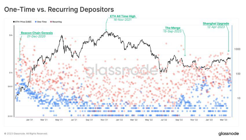 В Glassnode также обратили внимание на структуру стейкинг-пулов Ethereum и отметили, что они состоят в основном из крупных держателей, владеющих несколькими валидаторами и вносящими до тысячи депозитов в день. Однако крупные события, такие как генезис Beacon Chain, переход сети на алгоритм консенсуса Proof-of-Stake и предстоящее обновление Shapella привели к резкому увеличению числа разовых стейкеров.