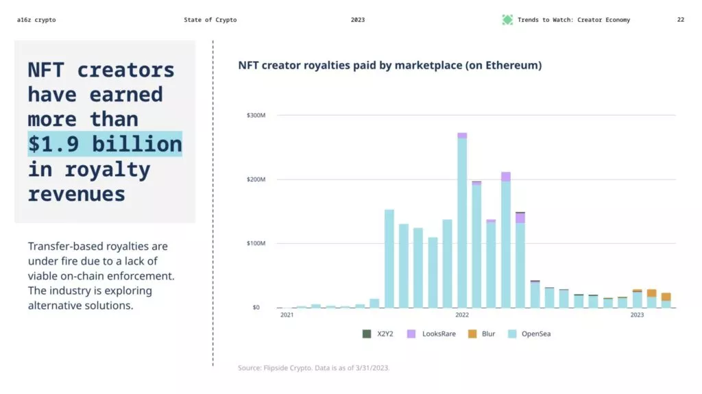 В исследовании отмечается и возрождение сектора невзаимозаменяемых токенов благодаря развитию DeFi-приложений и Web3-игр. За последние два года NFT-маркетплейсы выплатили авторам отчисления на сумму $1,9 млрд.