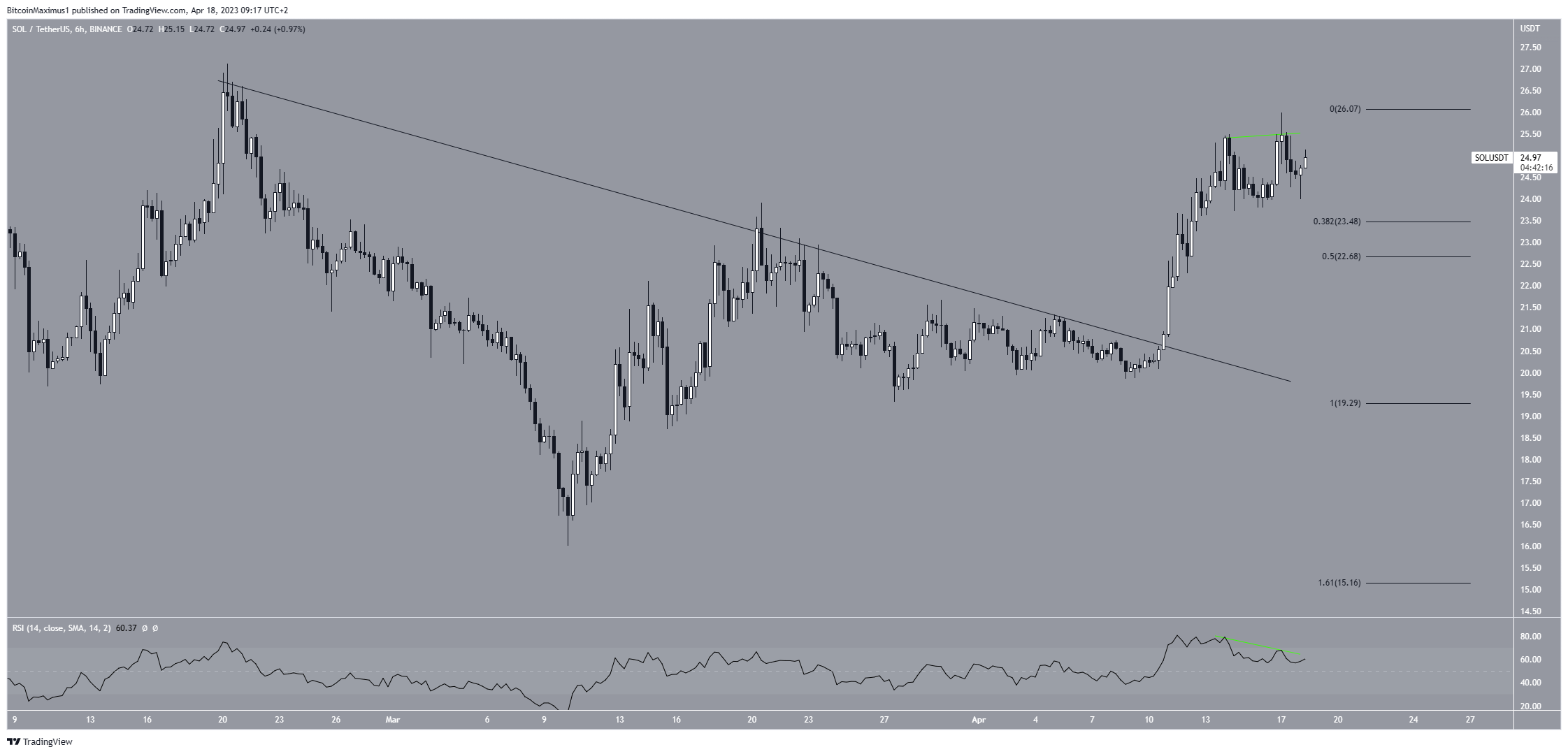 Если это произойдет, SOL может просесть в направлении горизонтальной области $22,70 и уровня поддержки Фибо.