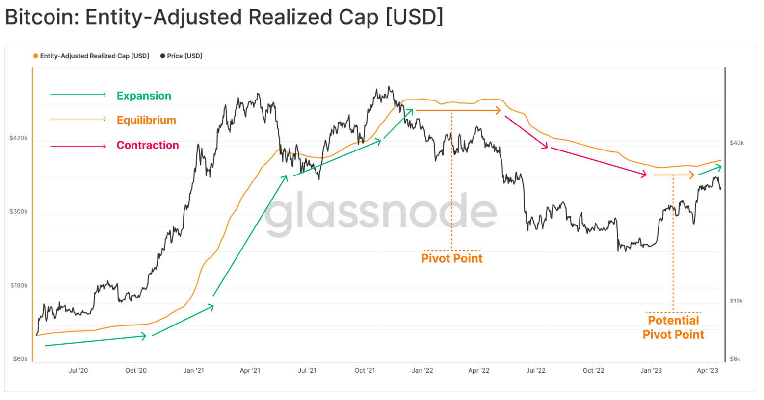 Кроме того, эксперты Glassnode рассмотрели индикатор реализованной капитализации (realized cap), оценивающий кумулятивную сумму всех эпизодов реализованных прибылей и убытков. При его расчете вместо рыночного курса BTC используется цена, которая была зафиксирована на момент последнего перемещения монеты в блокчейне (последний показатель неизрасходованных остатков по транзакциям, UTXO).
