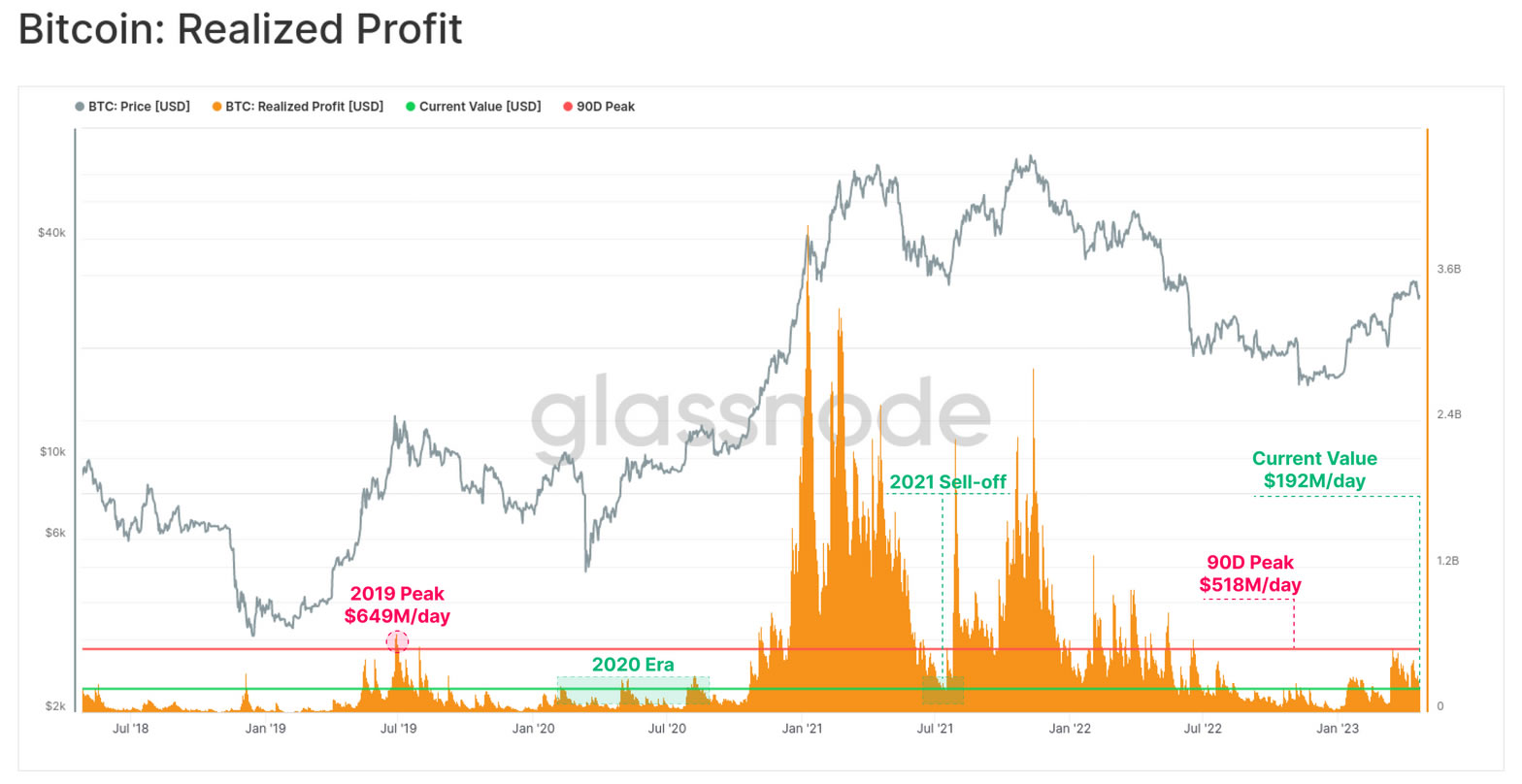 При этом в Glassnode отмечают, что размеры фиксации прибыли в долларовом выражении в этом году все еще значительно ниже циклических максимумов 2021 года. Этот показатель можно сопоставить со значениями, зафиксированными в 2019 году, когда курс BTC устроил ралли с $4 000 до $14 000.