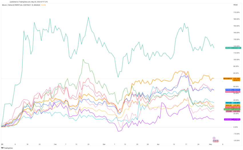Для начала отметим, что, несмотря на начальный шок, биткоин все же запустил ралли, и с начала года цена выросла на 70%+. Впрочем, за последние 30 дней динамика активов начала демонстрировать дивергенцию и идти различными путями.