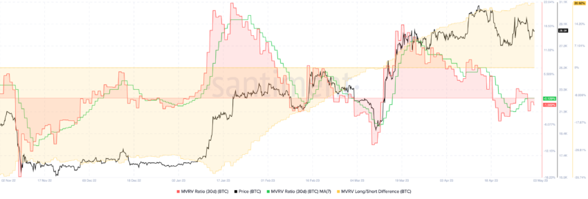 Тем временем 30-дневный индикатор MVRV (красный цвет) снова опустился ниже нулевой отметки. Этот коэффициент рассчитывает соотношение рыночной и реализованной стоимости монеты. Значение ниже 0% означает, что усредненный трейдер в последние 30 дней снова находится в зоне убытка.
