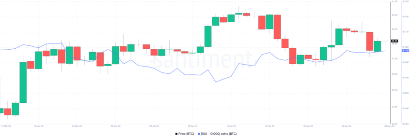 Кроме того, усиливающиеся подозрения относительно того, что Центробанк, возможно, уже достиг пиковых значений ставки, стали привлекать больше внимания к биткоину. Объемы накопленных резервов BTC-китов и акул, владеющих от 100 до 10 000 BTC, вернулись на уровни, на которых они находились на момент начала агрессивных продаж в конце марта.
