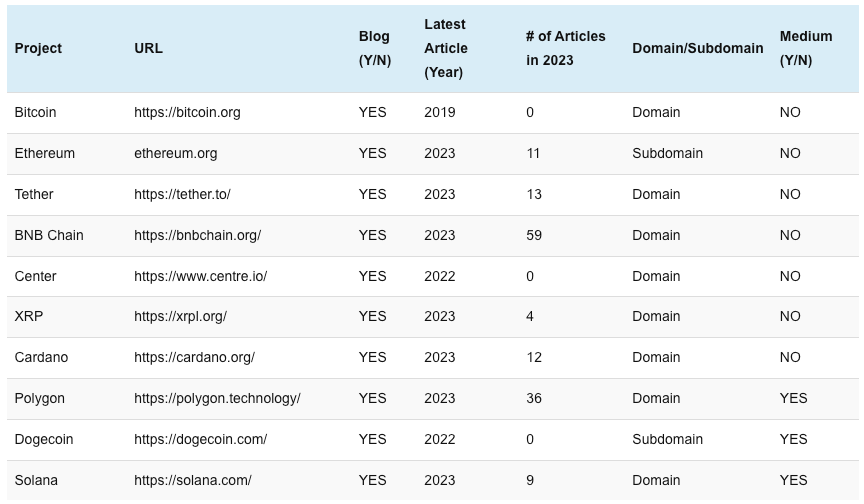 Согласно данным источников Cointelegraph, методология исследования была «простой, но трудоёмкой». Сначала аналитики вручную проверили соответствующие сайты тысячи топовых криптопроектов на предмет наличия у них блога. Затем они оценили количество статей, опубликованных за последние годы, а также проверили, сколько новых постов в блогах было опубликовано в 2023 году.