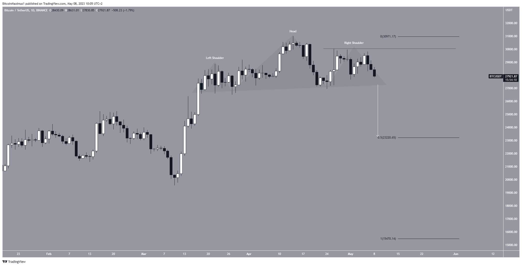 Если этот прогноз материализуется, а размер снижения окажется равен высоте всего паттерна (белый цвет), это может отправить курс BTC к $23 400 (уровень Фибо 0,5 коррекции, черный цвет).