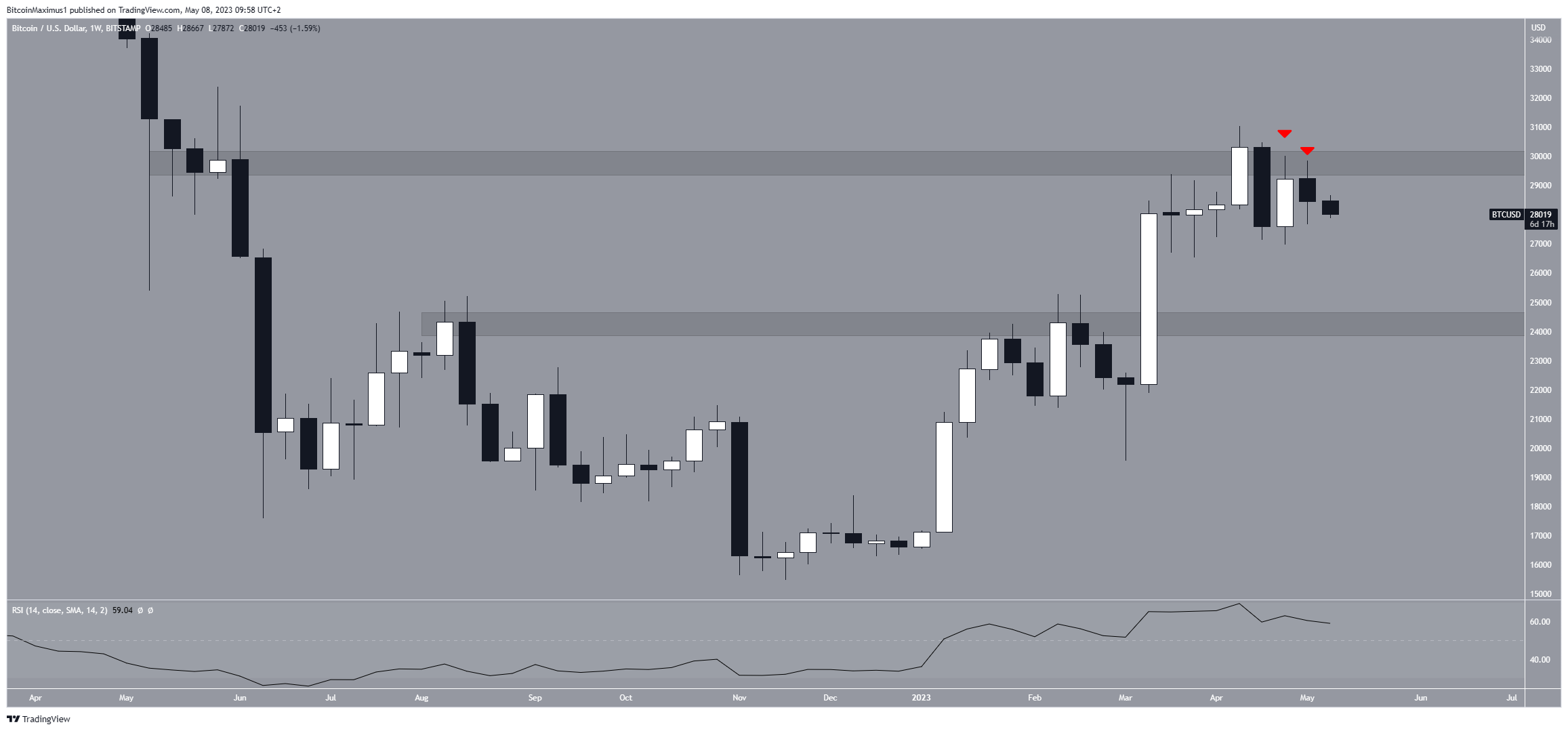 В результате область $29 800 была подтверждена как сильное сопротивление на недельном графике. Возможно, оно ознаменовало собой локальную вершину.