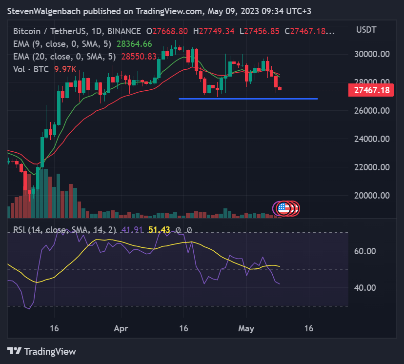 Похоже, цена BTC нацелена на следующий ключевой уровень поддержки на отметке $ 26 800. Движение ниже 9-дневной и 20-дневной линий EMA произошло после того, как между двумя техническими индикаторами сработал медвежий флаг, при этом 9-дневная линия EMA за последние 4 дня пересеклась с более длинной 20-дневной линией EMA.