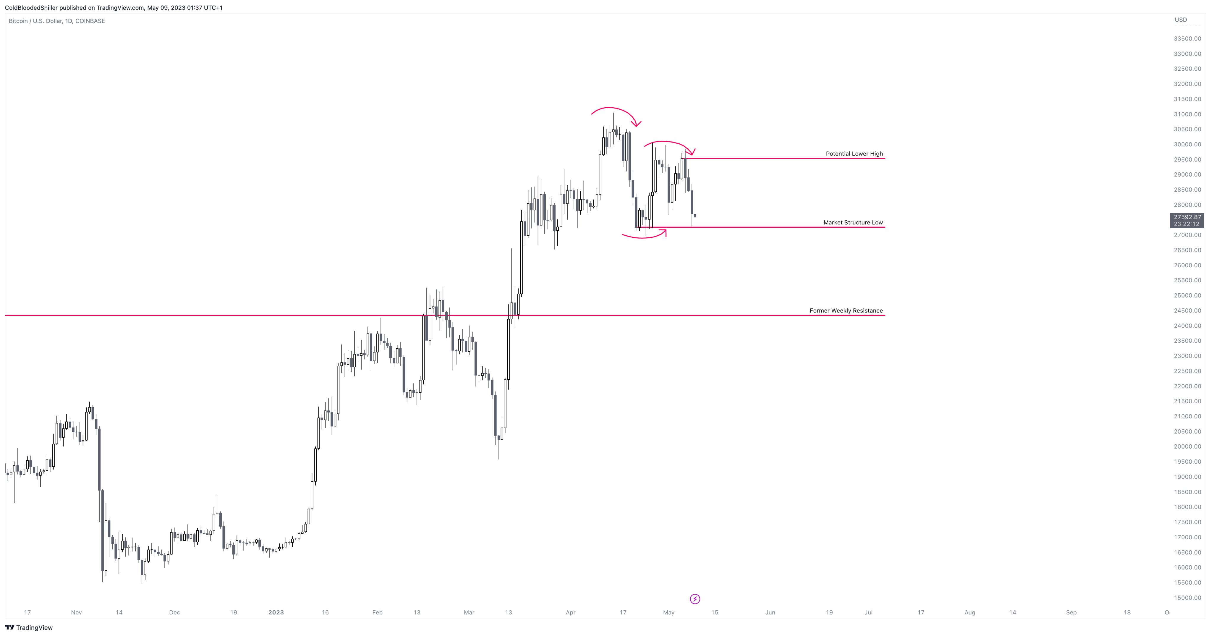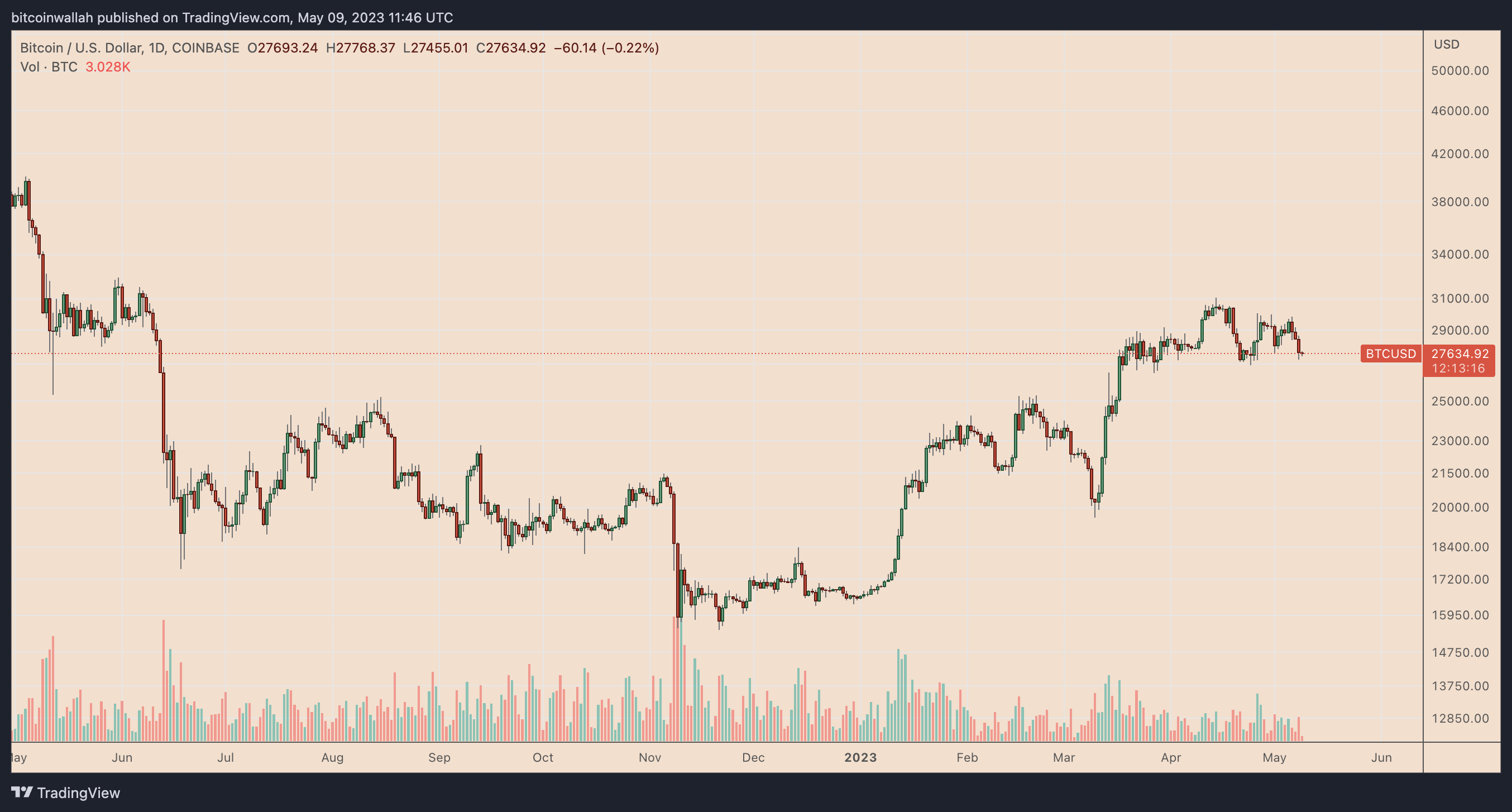 Цена BTC упала ниже $27 500 9 мая, что на 8% ниже локального максимума в $29 850, установленного три дня назад. Более того, падение сопровождалось ростом объемов торгов, что говорит о том, что движение имеет импульс.
