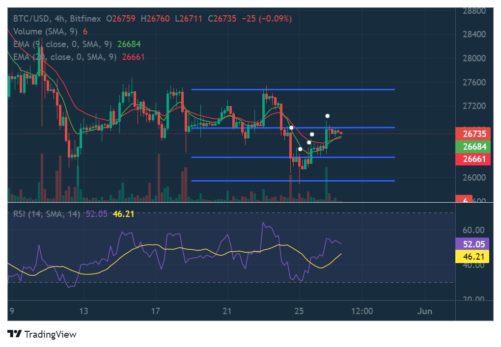 На 4-часовом графике BTC бычий технический флаг был на грани срабатывания, поскольку линия 9 EMA стремилась пересечь линию 20 EMA. Если это пересечение произойдёт, цена ведущей криптовалюты может превратить уровень сопротивления на $ 26 850 в поддержку.
