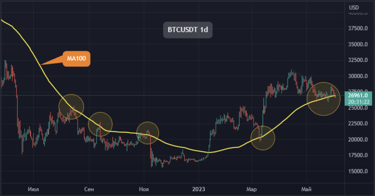 С технической точки зрения цена биткоина на дневном графике все еще находится над МА100. Данная скользящая средняя исторически довольно часто выступала в роли поддержки или сопротивления для цены. В последний раз МА100 служила сопротивлением в начале ноября 2022 года, позже, в январе 2023 года цена ее пробила и сейчас актив находится над МА100.