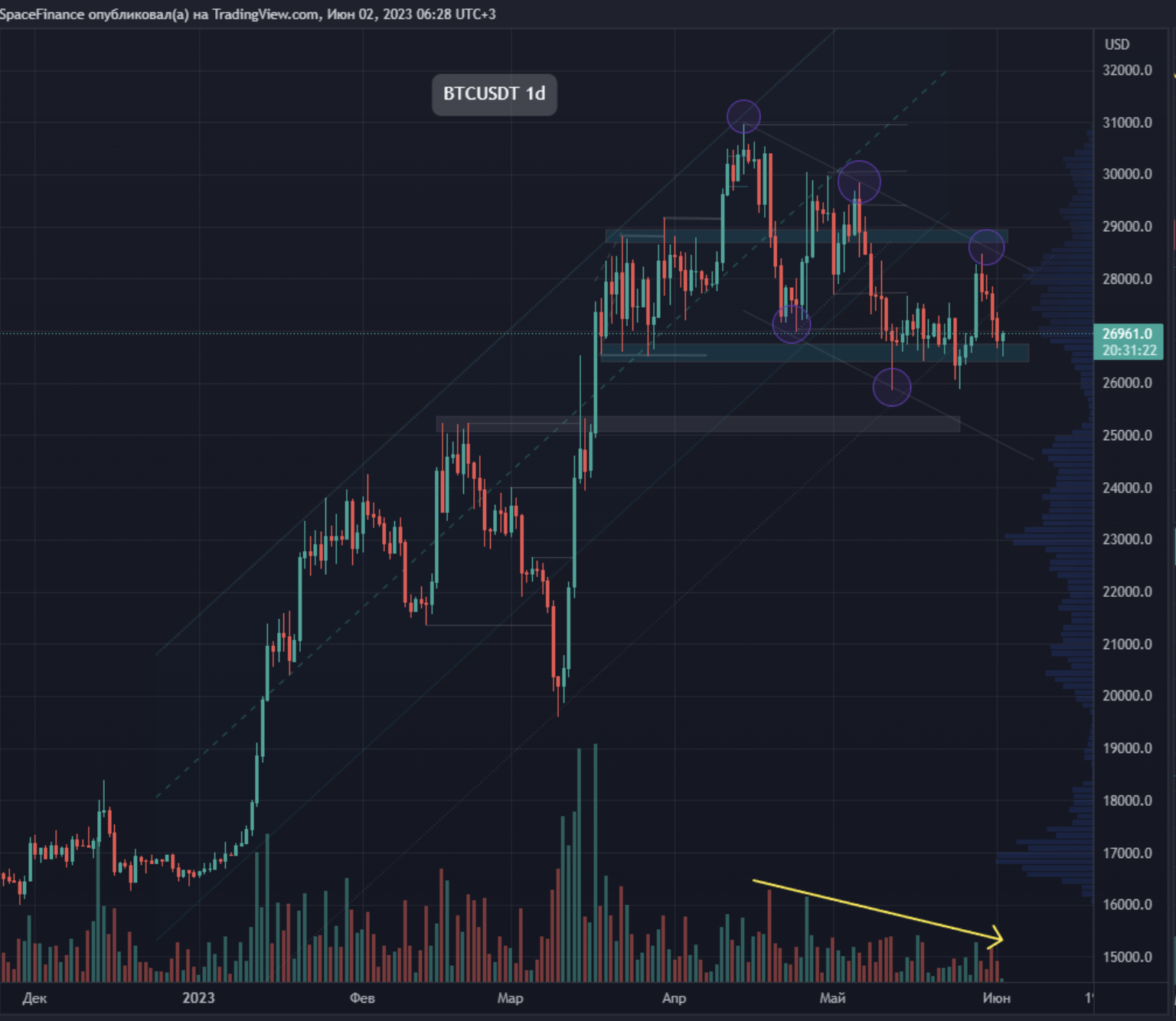 Уровень $26 300 — $26 600 был очень привлекательным для трейдеров, так как за ним скопилось большое количество ликвидности и сейчас она вся снята. Но второй важный уровень, это зона $25 000. Цена все еще может туда спуститься, для того, чтобы вытряхнуть «слабые руки» но это должно случиться (если случится) до 13 июня. При этом важно смотреть реакцию на данный уровень.