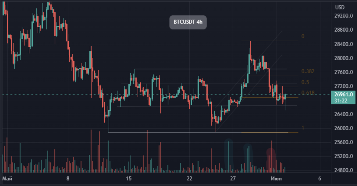 Уже три недели биткоин (BTCUSD) находится в локальном боковике, торгуясь в диапазоне от $25 860 до $28 470. Активность и объемы на рынке довольно низкие, так как участники рынка находятся в некотором замешательстве. Больше всего неопределенности вносят макроэкономические данные, в особенности статистические показатели экономики США.