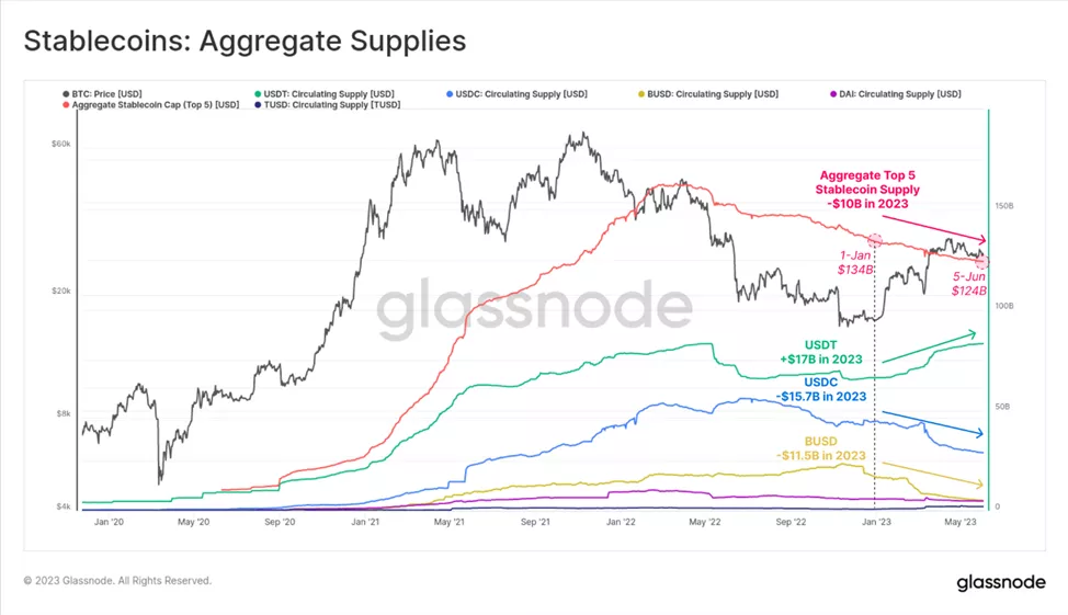 Снижение капитализации сегмента стейблкоинов было обусловлено падением показателей USDC и BUSD на $15,7 млрд и $11,5 млрд (значения с начала года). Лидер рынка — USDT — смог выйти на новый ATH ($83,1 млрд).