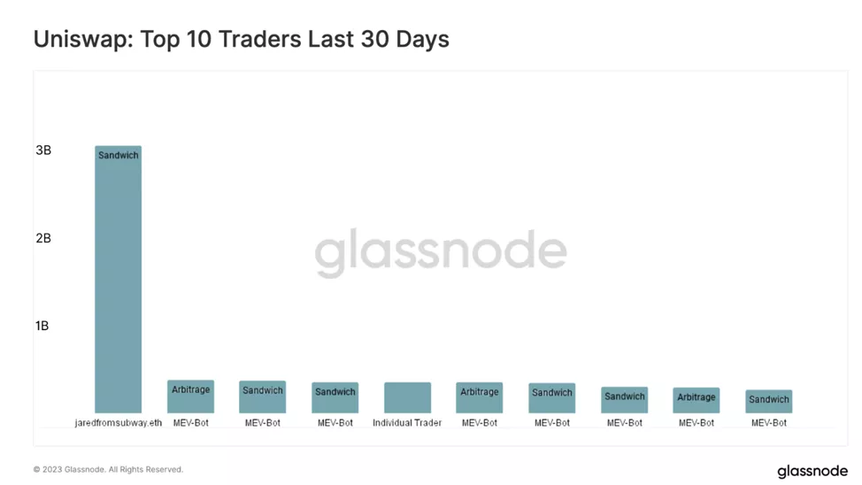 Девять из десяти наиболее активных адресов представляли собой МEV-ботов. Крупнейший из них провел сделки на ~$3 млрд.