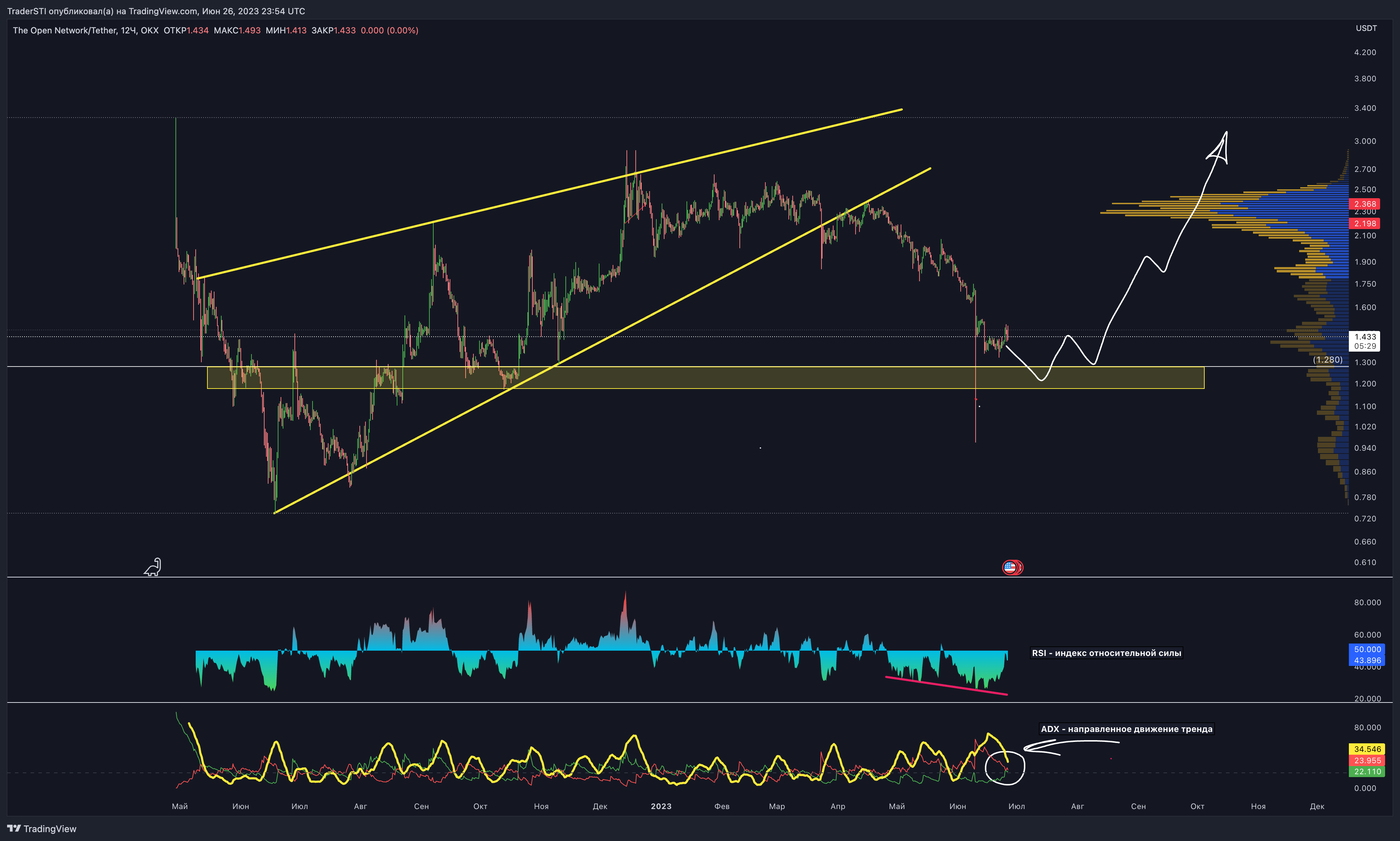 В свою очередь ADX — это как барометр для трейдеров. Он не говорит, будет ли погода солнечной или дождливой (направление тренда), но он показывает, насколько сильным будет ветер (сила тренда). Если ADX ниже 20, это как слабый ветерок — тренд слаб или его вообще нет. Если ADX от 20 до 40, у нас целый ураган — сильный тренд. Если ADX больше 40, впереди торнадо (очень сильный тренд). И наконец, если ADX больше 60, это чрезвычайно сильный тренд. Возвращаясь к TON, если ADX начинает уменьшаться, это может быть знаком, что покупатели устали. Возможно, они остановятся на отдых, и медведи (продавцы) получат свой шанс (график).